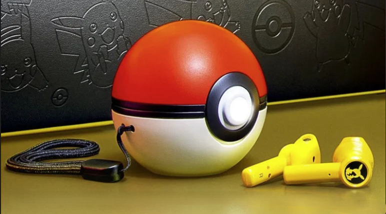 Poké Ball charging case with the earbuds inside, plus any accessory compartments.